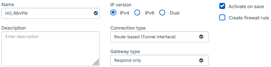 Connection type Select Route-based (Tunnel interface). This creates a tunnel interface between two endpoints. The interface is named xfrmfollowed by a number.Gateway type Select the following gateway type: