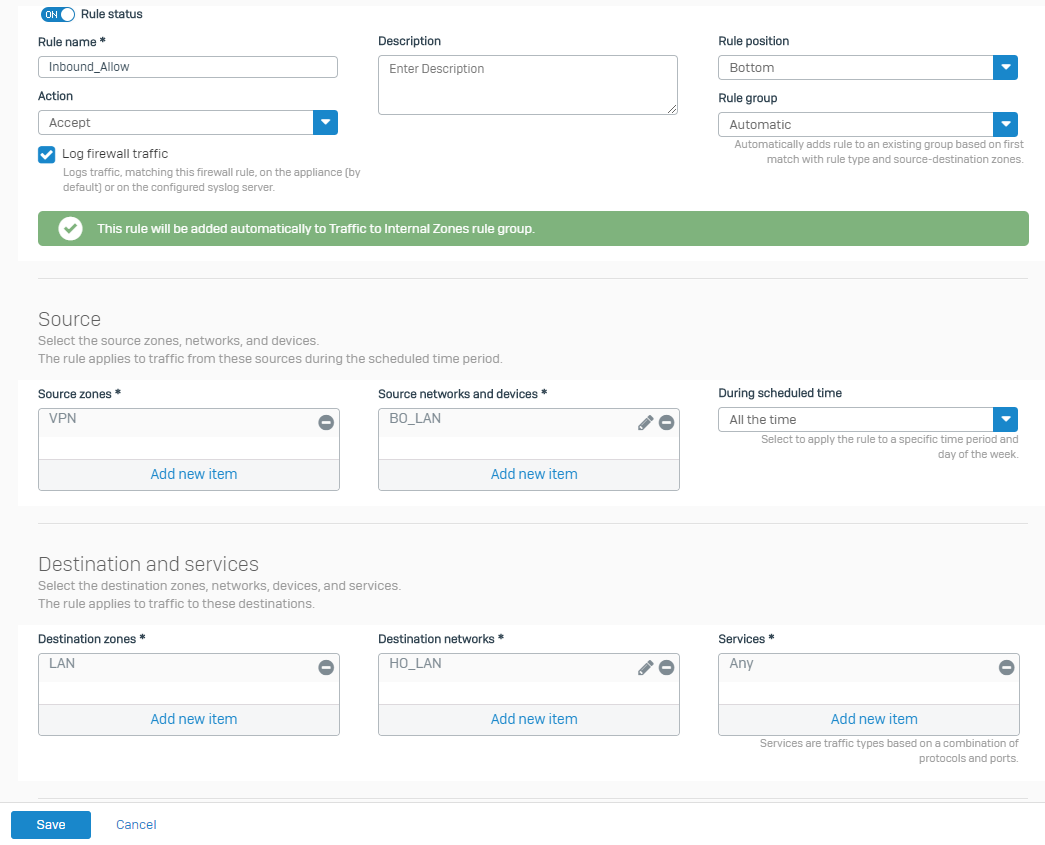 Setting Value Rule name Inbound_AllowLog firewall traffic Select the setting. Source zones VPNSource networks and devices BO_LANDestination zones LANDestination networks HO_LANExample: