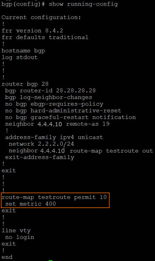 bgp(config-router-af)# neighbor 45.45.45.19 route-map testroute out