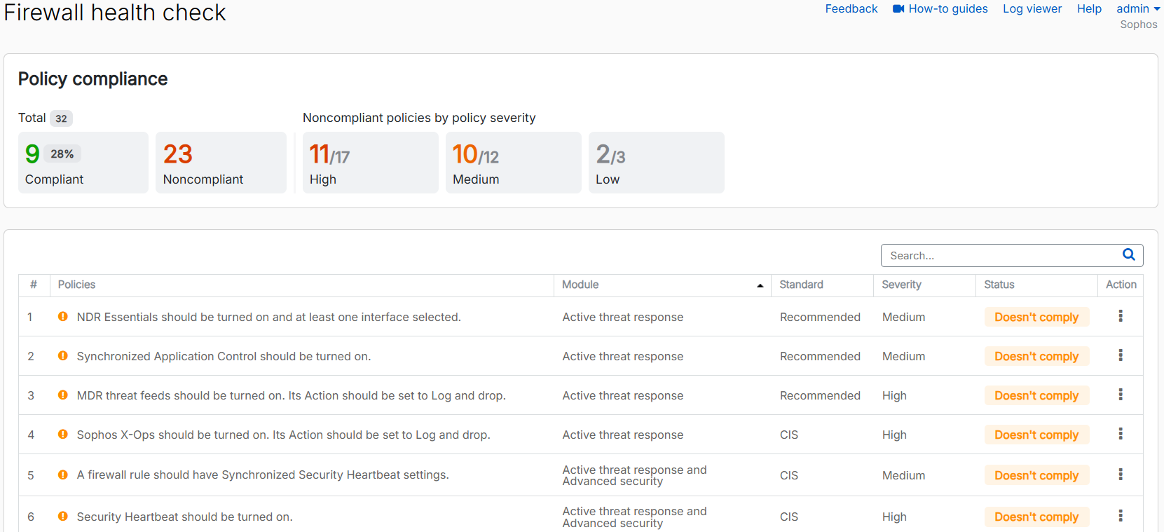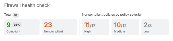 ファイアウォールのヘルスチェックウィジェットは、チェックされた構成の総数、適合および非適合構成の数を表示します。非準拠の設定は、ネットワークセキュリティリスクに応じて、重要度に応じて表示されます。