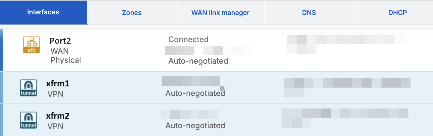 トンネルには XFRM インターフェイスが自動的に作成されます。たとえば、xfrm1 および xfrm2 インターフェイスが WAN インターフェイスの下に作成されていることがわかります。