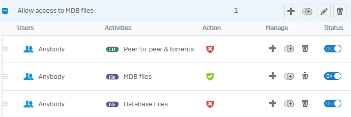 このサンプルポリシーにカテゴリブロックを追加する場合は、.mdb ファイルの許可ルールの上に追加する必要があります。以下のポリシーでは、Peer-to-peer & torrents カテゴリへのアクセスをブロックし、それ以外の Web サイトからの .mdb ファイルへのアクセスのみを許可しています。