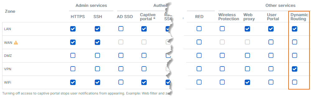 ローカルサービスACLの下、ダイナミックルーティング列で、LANやVPNゾーンなど、BGPルーティングに含めたいゾーンを選択します。