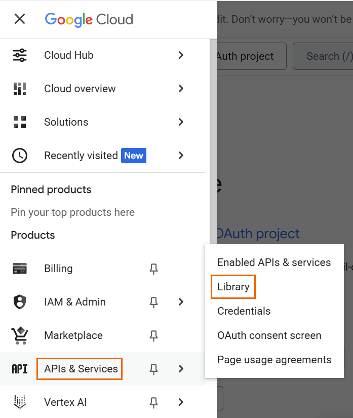 In the left navigation menu, go to APIs & Services > Library.