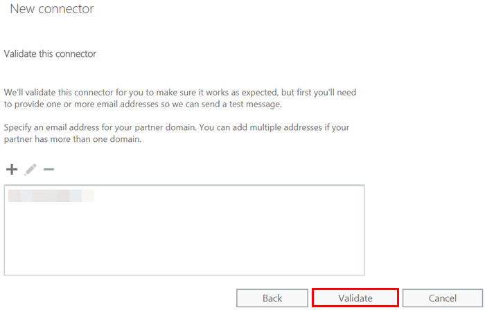 Click the Plus icon, enter an email address, click OK and then click Validate. The connector may not validate successfully until MX and SPF are changed.