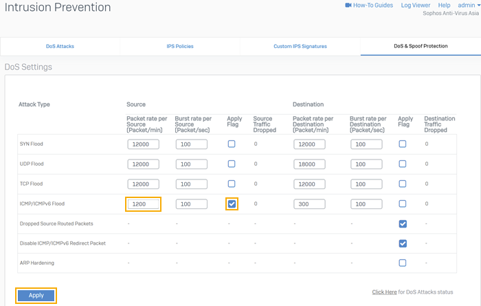 For example, for ICMP/ICMPv6 flood, we've set Packet rate per Source (Packet/min) to 1200 and selected Apply Flag next to it to turn on scanning for ICMP and ICMPv6 traffic.