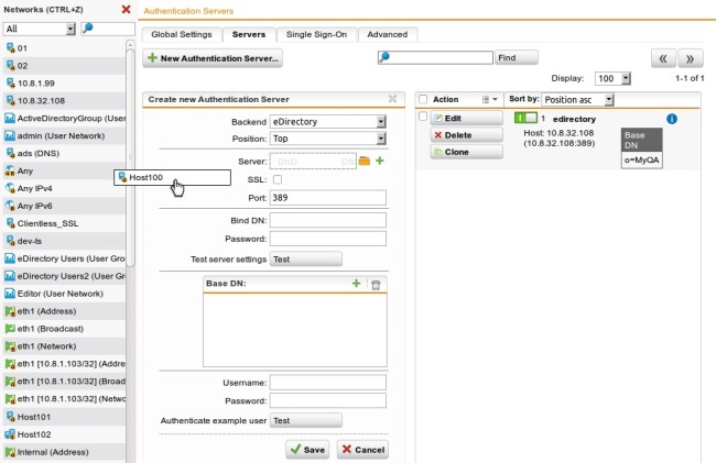 The object list gives you quick access to WebAdmin objects like users/groups, interfaces, networks, and services to be able to select them for configuration purposes. Objects are selected simply by dragging and dropping them onto the current configuration.